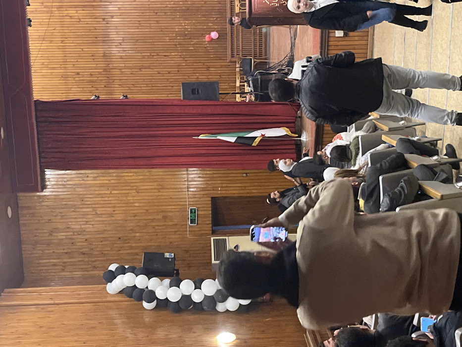 An auditorium with wooden walls and a red stage curtain features a Syrian flag. Black and white balloons decorate the left. Audience members sit in rows of chairs, some wearing formal attire and head coverings. A person in the foreground uses a smartphone to record. A speaker stands at a podium on the upper right, with a person in a hijab beside them. Two pink balloons are near the ceiling.