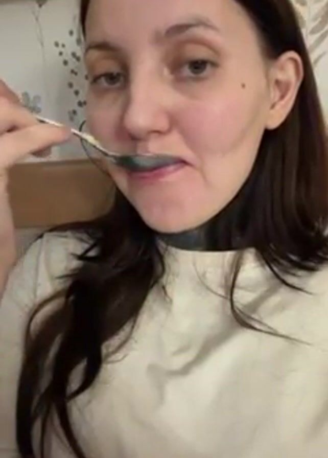 A fair-skinned woman with dark hair and a neck tattoo is seen from the chest up, eating from a spoon. She is wearing a white t-shirt and has a ring on her finger. She is looking down and then up at the camera as she eats. The background includes a wall with a light floral pattern and a wooden headboard. The audio has voices speaking in a language other than English.