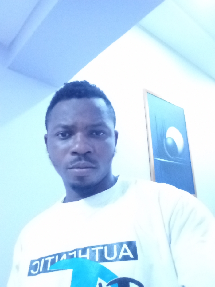 An adult male is positioned centrally in a close-up, head-and-torso shot, facing directly forward with a neutral expression. He is of African descent, presenting short, dark, textured hair, a trimmed mustache, and a short beard. He wears a light-colored (off-white or pale yellow) short-sleeved t-shirt. The front of the shirt displays the word "AUTHENTIC" in dark, mirrored lettering, partially obscured by his chin, above a blue, abstract graphic. The background features light-colored walls. To the subject's right, a vertically oriented rectangular picture frame with a light border hangs on the wall. The artwork within the frame consists of a blue background with a prominent pale, circular or spherical object that exhibits a curvilinear shadow or design, suggesting an abstract or minimalist motif. The upper left portion of the image reveals a light-colored ceiling. The overall scene is illuminated by cool-toned lighting, imparting a subtle blue cast. The depicted location is an indoor setting within the city of Lokoja, Nigeria.