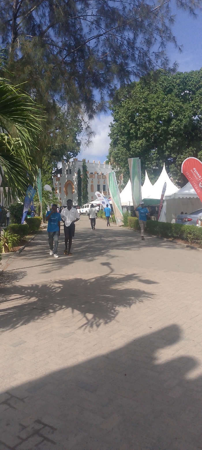 An outdoor scene captured in Tudor ward, Kenya, depicts a paved pathway leading towards a distinctive white building under a clear blue sky with scattered clouds