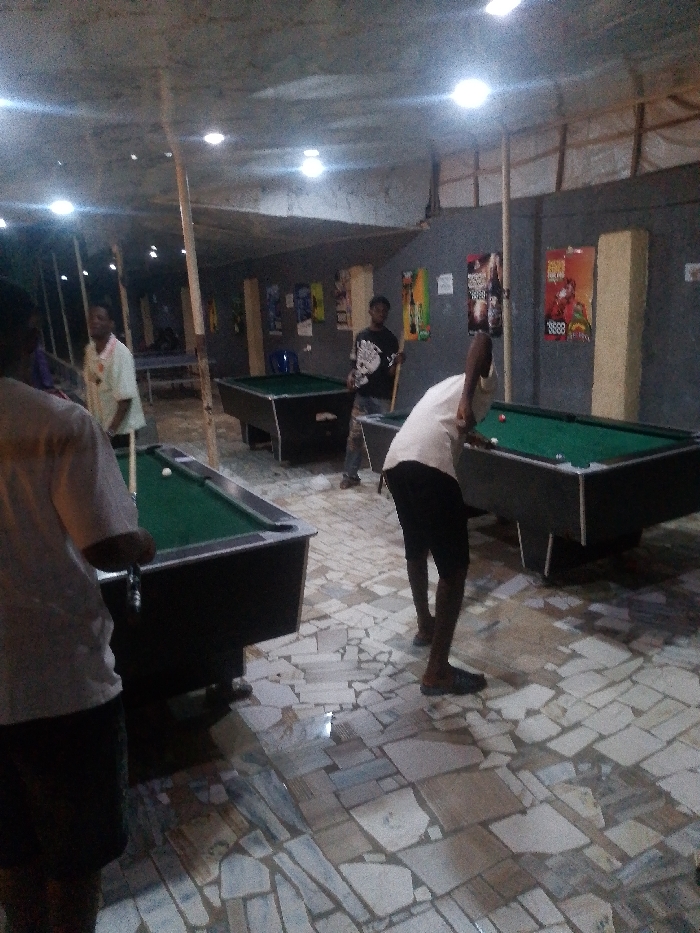 A group of men play billiards in a dimly lit, open-air establishment. Three pool tables are visible, with men positioned around them, cues in hand. Posters adorn the back wall, adding visual interest to the somewhat industrial setting. The tiled floor has a fragmented pattern, and the overall atmosphere is casual and relaxed. Poles support the roof structure, which is constructed of fabric or tarpaulin.