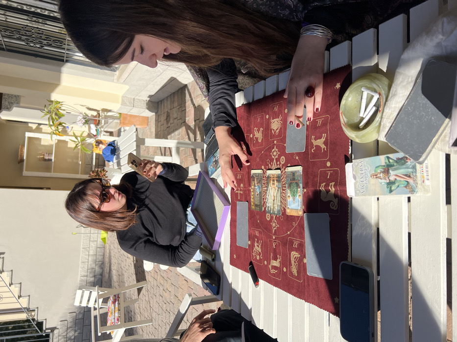 The scene is an outdoor patio, likely at a private residence in Varese, Italy, illuminated by direct sunlight. Three individuals are present around a white slatted patio table. On the left, a female with brown hair, wearing sunglasses and a black long-sleeved top over a lighter garment, holds a gold-colored smartphone with a patterned case in her right hand, viewing its screen. To her left, part of a male's arm and shoulder is visible. An open, empty purple rectangular box and a dark-colored smartphone are on the table near her. At the center of the table, a dark red rectangular cloth, patterned with lighter astrological and occult symbols, is spread. Three tarot cards are face-up in a vertical line, displaying detailed illustrations. Multiple grey-backed cards are also laid out, some face down. A black Bic-style lighter rests on the cloth. On the right, a female with long brown hair, wearing a dark top and a patterned shawl, has her left hand extended over the tarot cards. Her fingernails are painted red, and she wears silver bangles and a large red ring on her left hand. A white box labeled "VICEVERSA TAROT," featuring an illustration of a woman in a green dress, is on the table. An oval, light green translucent ashtray contains three white cigarette filters. Another dark-colored smartphone is face down on the table near the ashtray. The background shows a light-colored stucco building wall with a barred window and a white open shelving unit holding plants and objects. Stone steps with a metal railing ascend in the far left. The patio floor consists of light-colored interlocking pavers, with strong shadows cast by the direct sunlight. White slatted patio chairs are visible in the background.