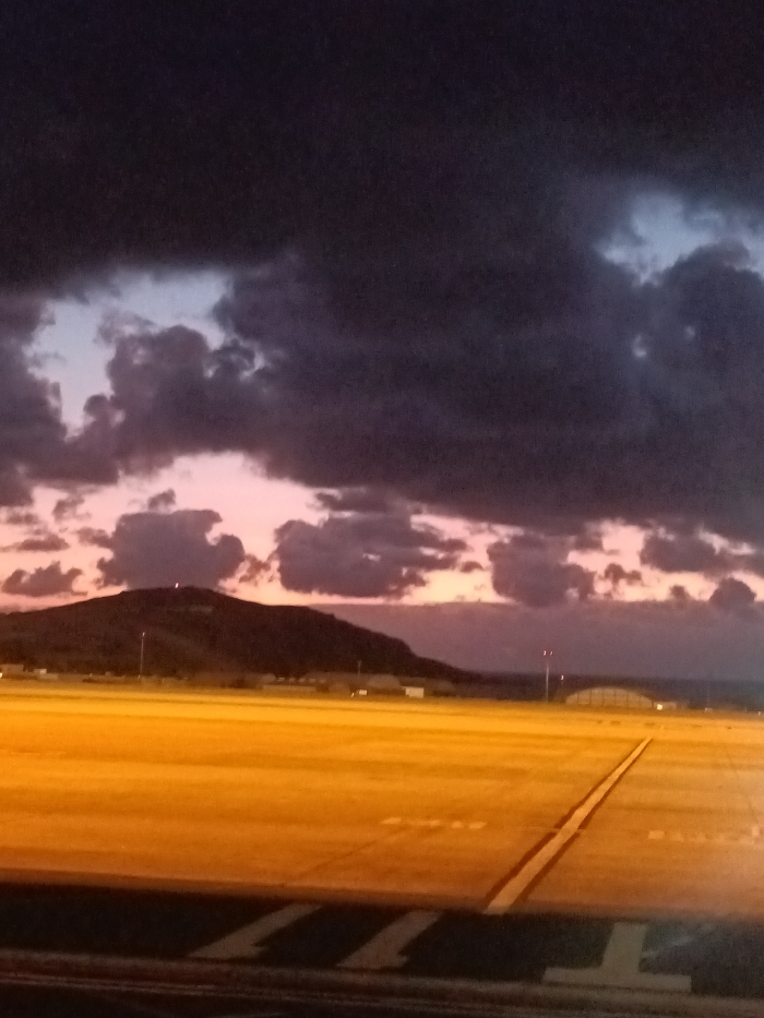 A photo shows an airfield at dusk. In the foreground, a runway stretches into the distance, marked with black lines on a yellow surface. Behind the runway, a low hill is silhouetted against a sky tinged with pink and purple. Dark, ominous clouds fill the upper portion of the frame, hinting at an approaching storm. Distant buildings and lights are faintly visible beyond the hill, adding depth to the scene.