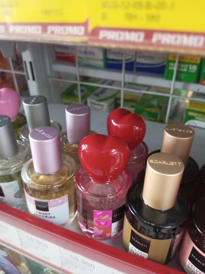 A close-up displays multiple bottles of "Scarlett" brand fragrances on a shelf, possibly in a store. The bottles have different-colored caps, including silver, light purple, gold, and distinctive red heart shapes. Each bottle features a label indicating different scent names like "Sweet Memories" and "Golden Elixir." A red shelf edge is visible, bearing a price tag of "59.900." Above the perfumes, a shelf tag reads "PROMO," suggesting a promotional offer. Over-the-counter medications can be seen on the shelves behind the perfumes.