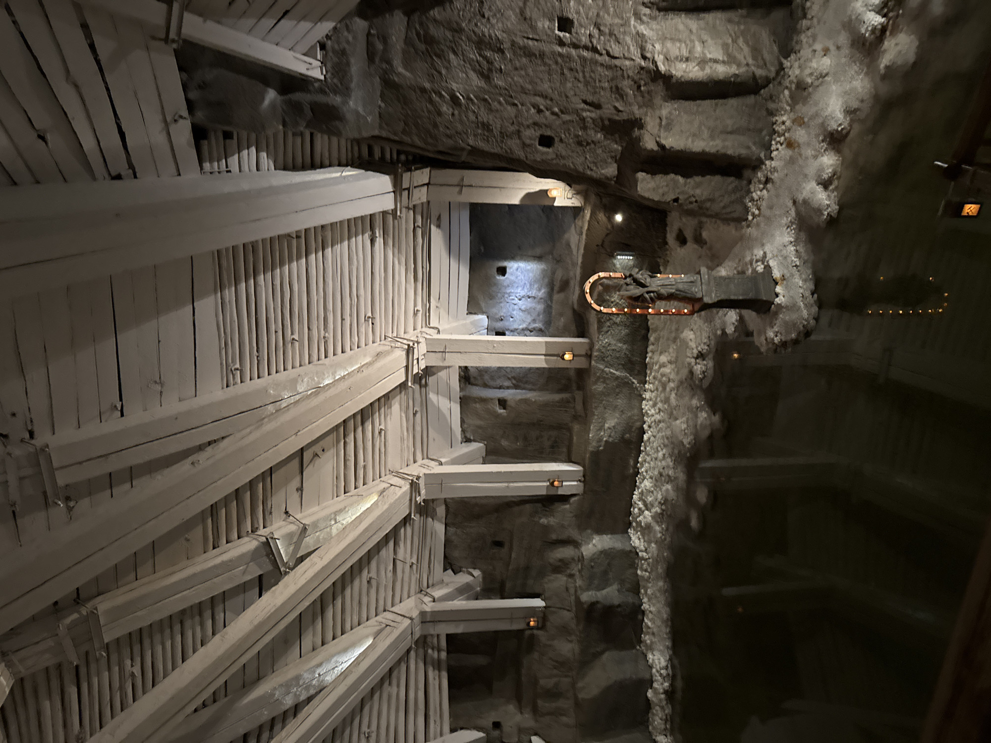 The image depicts an interior view of the Wieliczka Salt Mine in Wieliczka, Poland