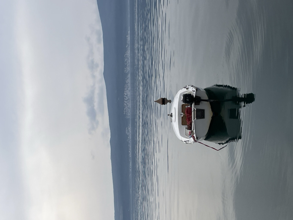 The image captures a maritime scene in Donja Lastva, Montenegro, under an overcast sky. A white, open-top motorboat, equipped with a black outboard engine, is centrally positioned in the lower-middle ground. Red coiled ropes or nets are visible within the boat's interior. A red rope extends from the vessel's port side towards the lower-left of the frame. Floating in the water directly behind and slightly to the left of the boat is a conical buoy with a brown upper section. Both the boat and the buoy produce clear reflections on the calm, grey-blue water surface, which exhibits subtle ripples. In the background, a dark, undulating mountain range spans the horizon. A distant settlement, characterized by a line of small, light-colored structures, is visible along the base of these mountains. The sky is uniformly light grey, with darker clouds congregating above the mountain peaks. No individuals are present, and no actions or interactions are depicted.