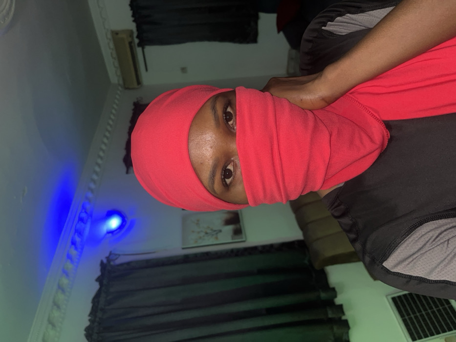A person wearing a red cloth mask and a dark athletic shirt with gray sleeves looks directly at the camera. The mask covers the nose and mouth, leaving only the eyes visible. Their right hand is slightly raised, touching the mask near the cheek. The background shows a room with dark curtains, air conditioning unit, a small framed picture, and a small solar panel. A blue light is on the ceiling.
