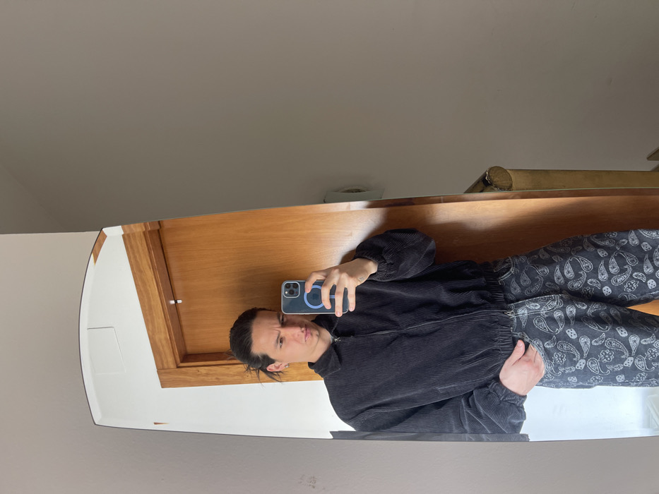 An individual is depicted in a self-portrait captured via a mirror reflection within an indoor residential setting in Terrassa, Spain. The subject is an adult male with dark hair styled in a bun or ponytail, displaying a slight frown. He wears a dark corduroy bomber jacket with a zippered front and dark jeans patterned with light-colored paisley designs. A single stud earring is visible in his left ear. He holds a smartphone with a clear case and a blue MagSafe ring in his right hand, angled towards the mirror to take the photograph. The mirror, which has a rounded top edge, reflects a light-colored wooden door and its frame behind the individual's reflection, with a white rectangular panel visible on the wall above the door. To the right of the mirror, a plain light beige wall is visible, along with a wooden handrail in the lower right, suggesting a staircase or hallway.