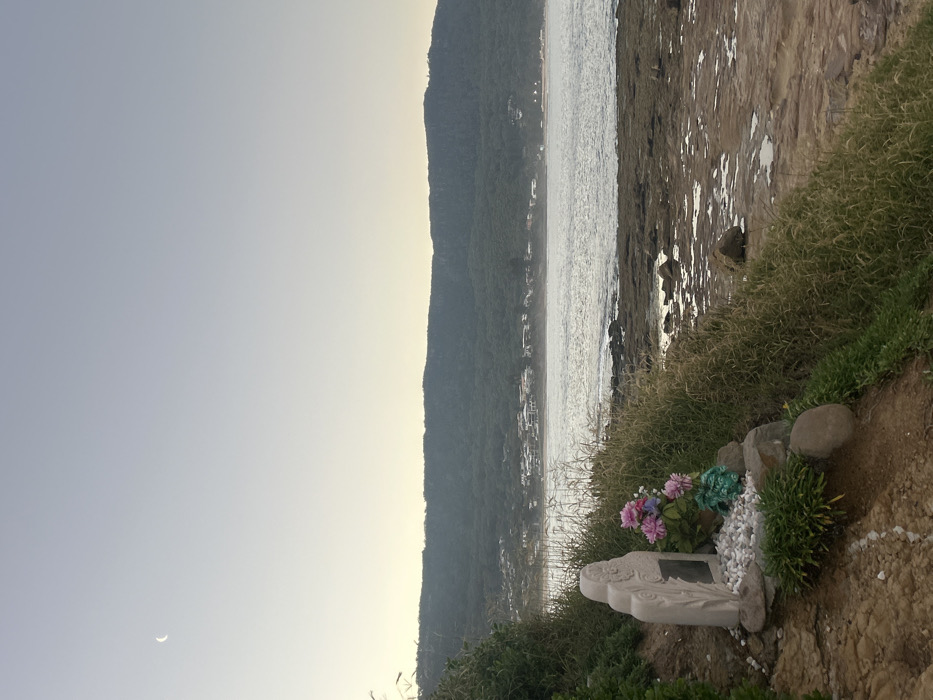 The scene depicts a coastal landscape within the Wollongong City Council area, Australia, viewed under low light conditions, possibly dusk or dawn. In the upper left quadrant of the sky, a crescent moon is visible against a gradient of light blue transitioning to pale yellow near the horizon. The background features a dark green, heavily vegetated mountain range or escarpment running horizontally. Below this, a line of white buildings, indicative of a coastal town (Coledale), are visible along the distant shoreline. The midground is dominated by a large body of water, the ocean, with white-capped waves breaking near a rocky intertidal zone composed of dark, wet rock shelves and pools of water. In the foreground, to the left, a light-colored, possibly stone, memorial stands on an earthen bank covered with dry, tall grasses and some green foliage. The memorial has an ornate, curved top and a rectangular recessed dark panel in its lower section. At the base of the memorial, a cluster of pink and purple artificial flowers is placed, surrounded by scattered white pebbles. A small, blue-green object rests near the flowers. The immediate ground in the foreground is a reddish-brown dirt path or slope. No individuals are present in the image.