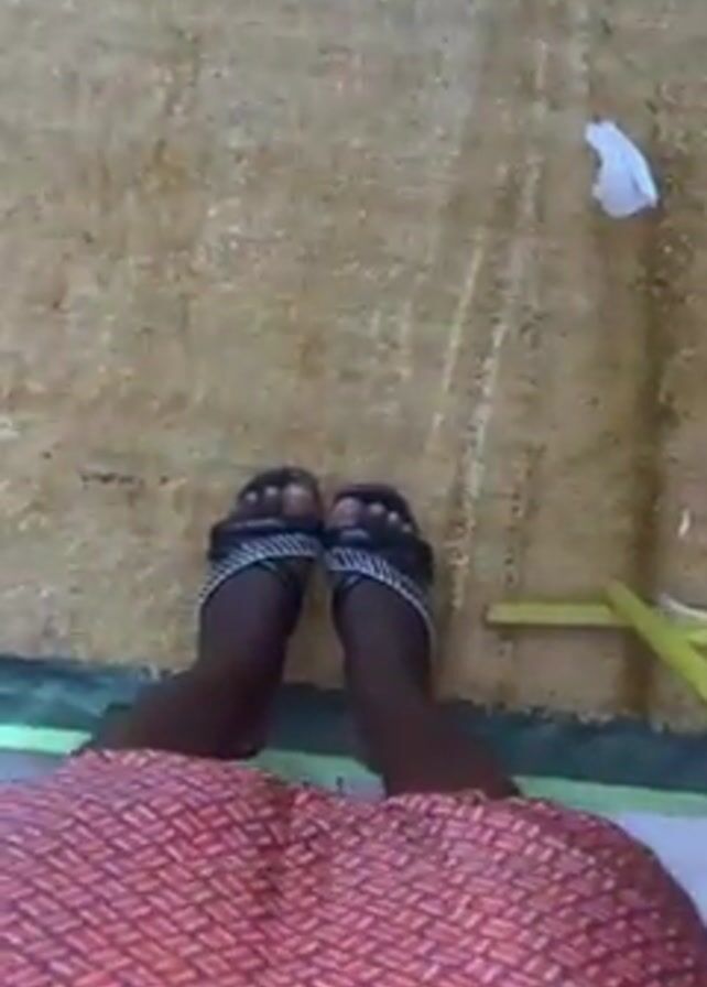 A first-person shot shows a person standing on a beige and brown patterned carpet. They are wearing a red and orange patterned dress and black sandals with a silver and white design. The camera is pointed down at the person's feet and the carpet. There is a piece of white paper and a yellow object on the carpet next to their feet. The person shifts their weight slightly from one foot to the other. The audio appears to be of a public gathering or speech.