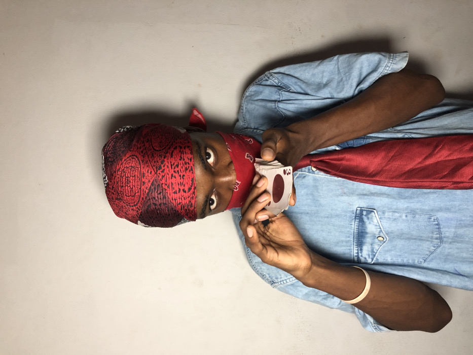 A dark-skinned individual, appearing male, is centered in a chest-up portrait against a plain light grey wall in Ngleshi Amanfro, Ghana. The person wears a red bandana with a black pattern covering the head, and a plain red bandana covers the lower half of the face, exposing only the eyes. The eyes gaze directly forward. A light blue denim shirt with two chest pockets, each secured by a metallic snap button, is worn. A red necktie with a diagonal textured pattern hangs loosely down the front of the shirt, untied. A light-colored bracelet or band is visible on the individual's left wrist. Both hands are raised in front of the chest, holding a stack of approximately 10-15 worn playing cards. The top card is light-colored and shows a faded red oval design with the numeral '3' partially visible in the lower right corner.