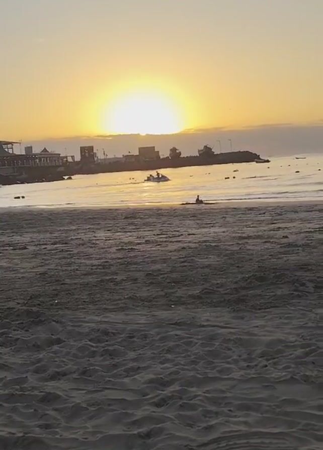 beach scene with a bright sunset. In the distance, the sun is setting over a body of water, reflecting light on the water's surface. There is a land formation in the distance, with what appears to be buildings or structures silhouetted against the sunset. Two jet skis are actively moving on the water near the land formation. The foreground consists of a sandy beach. The sky is clear with a soft color gradient from bright yellow near the sun to a pale blue at the top of the frame.