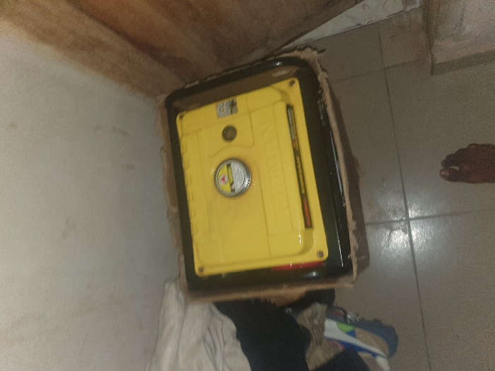 A yellow generator encased in a black frame sits in a corner. It is positioned between a wall and a tiled floor. The upper wall and ceiling show signs of water damage. A white cloth is visible beneath the generator, near an unidentified object. A partial view of a person's foot is seen on the tiled floor to the right.