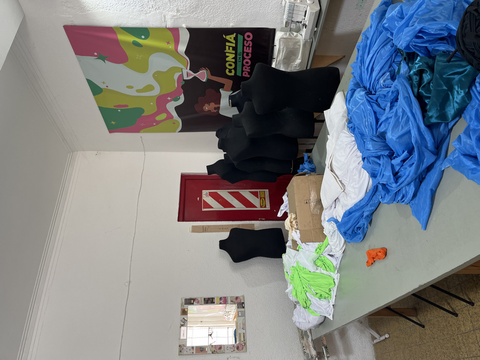 A cluttered room features sewing supplies. A table is covered with blue, white, and neon green fabrics. Nearby, a stack of black dress forms sits near a red door with white stripes. A poster hangs above them. A sewing machine stands atop a shelf. A small, ornate mirror is mounted on the wall.