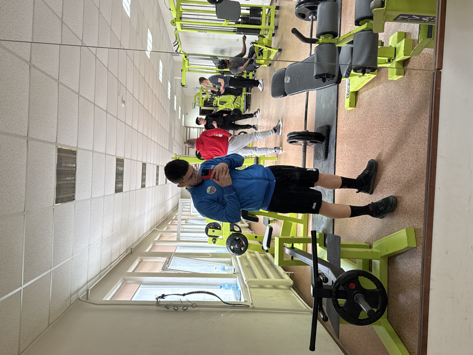 The image depicts an indoor gymnasium located in Pleven, Bulgaria, seen through a large wall-mounted mirror. Six male individuals are present. In the foreground, reflected centrally, is a male individual, approximately 18-25 years old, with short dark hair and glasses. He is wearing a blue long-sleeved athletic top with a green, white, and red emblem on the left chest, black athletic shorts with "SAAL" printed on the left leg, black athletic socks, and black athletic shoes. He holds a red smartphone with both hands, looking down at the screen, appearing to capture a mirror selfie or check messages. The gymnasium features light-colored walls, a suspended ceiling with square acoustic tiles and recessed fluorescent lighting fixtures, and a reddish-brown textured rubberized floor. A long row of white-framed windows extends along the left wall, with horizontal white panel radiators underneath. A blue plastic water bottle rests on one of the window sills. Various pieces of exercise equipment are visible throughout the room, predominantly featuring bright lime green frames with black upholstery and weight plates. Equipment includes: - A horizontal weight bench or rack with a barbell and black weight plate in the lower left foreground. - A barbell with black weight plates resting on a black mat in the mid-foreground. - An adjustable leg extension/curl machine with a lime green frame and black pads in the lower right foreground. - In the background, multiple weight machines, cable stations, and racks are arranged. These include several machines with vertical weight stacks and plate-loaded apparatuses. Five additional male individuals are visible in the background, reflected in the mirror: - One individual with light hair wears a red hooded sweatshirt, light grey athletic pants, and athletic shoes, standing with his back partially to the viewer, to the right of the main subject. - Another individual with dark hair wears a black long-sleeved shirt and black pants, standing facing the person in red. - A third individual wears a grey t-shirt and dark pants, standing further back and to the right, appearing to interact with a fourth, partially obscured individual also in dark clothing. - A fifth individual, with dark skin, wears a black t-shirt and dark pants, seated on a lime green and black weight machine on the far right. The individuals in the background appear to be engaged in standard gym activities, such as resting, conversing, or using equipment. The overall scene indicates an active but not overly crowded fitness environment.