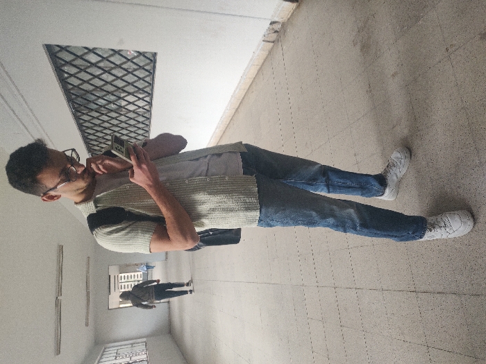 An interior hallway within Ash-Shaghour Municipality, Syria, is depicted. A male individual, approximately 20-30 years old, with dark hair and wearing glasses, stands in the foreground, facing slightly left. He is dressed in a light-colored, vertically striped short-sleeved collared shirt over a plain light t-shirt, blue denim jeans, and white sneakers. A dark backpack is carried on his left shoulder. He holds a light-colored smartphone with both hands, looking down at the screen, with his right thumb positioned near his chin. The corridor extends into the background, illuminated by multiple ceiling-mounted rectangular fluorescent light fixtures. Walls are white with minor scuffing near the base. The floor is composed of large, light-grey square tiles with subtle dark flecks. On the left side of the corridor, windows with horizontal bars are visible. On the right, a window features a dark diamond-patterned metal security grate. Further down the hallway, approximately 15-20 meters from the camera, a second individual wearing a dark hooded jacket and dark trousers is seen walking away. A third, indistinct figure in light-colored clothing is visible in the far distance.