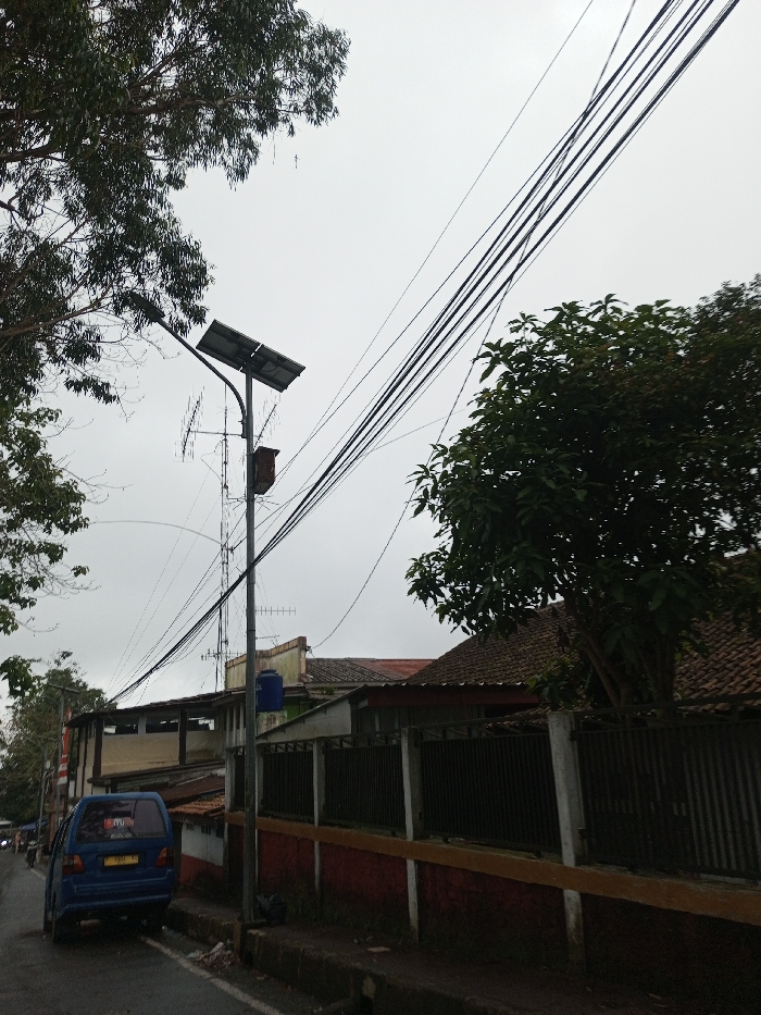 The image presents an overcast street scene in Ambakirano, Madagascar. The sky is uniformly light grey, occupying the upper half of the frame. In the foreground, a dark asphalt road extends from the lower left towards the mid-ground. A blue van is parked on the left side of the road, facing away; its yellow license plate displays partial characters. Adjacent to the road's right edge, a dark metal fence with vertical bars is situated atop a red and orange painted low wall. A gutter containing minor debris runs parallel to the wall. A grey utility pole stands centrally, equipped with a solar panel tilted upwards and a street light fixture extending horizontally to the left. Below the solar panel, multiple communication antennas are attached, alongside a brown electrical box. Numerous black utility cables originate from this pole, traversing diagonally across the sky to the right and descending downwards. Dense green foliage of a large tree is visible in the upper left quadrant. A smaller, bushy tree with dark green leaves is positioned on the right side, behind the fence. In the mid-ground, behind the utility pole and fence, various buildings with tiled roofs, some terracotta-colored, are discernible. One building, left of center, features a light-colored upper section and a blue cylindrical water tank mounted next to it. No individuals or specific actions are clearly depicted.