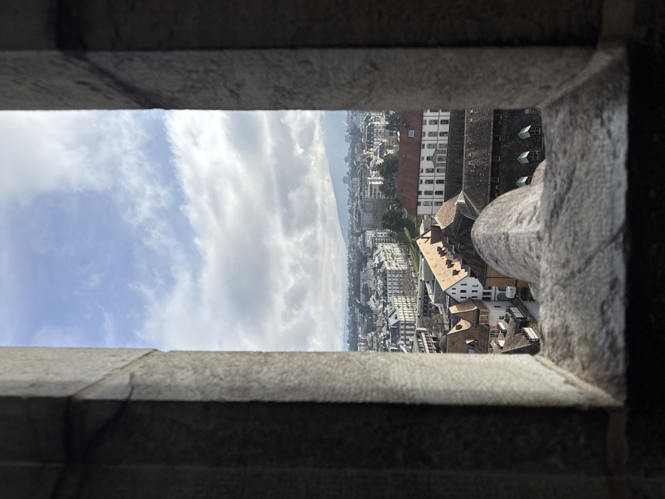 - "The image depicts an elevated panoramic view of the city of Geneva, Switzerland, captured through a stone-framed opening, consistent with a vantage point from one of the towers of St" by FM-z8OuP2, licensed under CC BY 4.0
