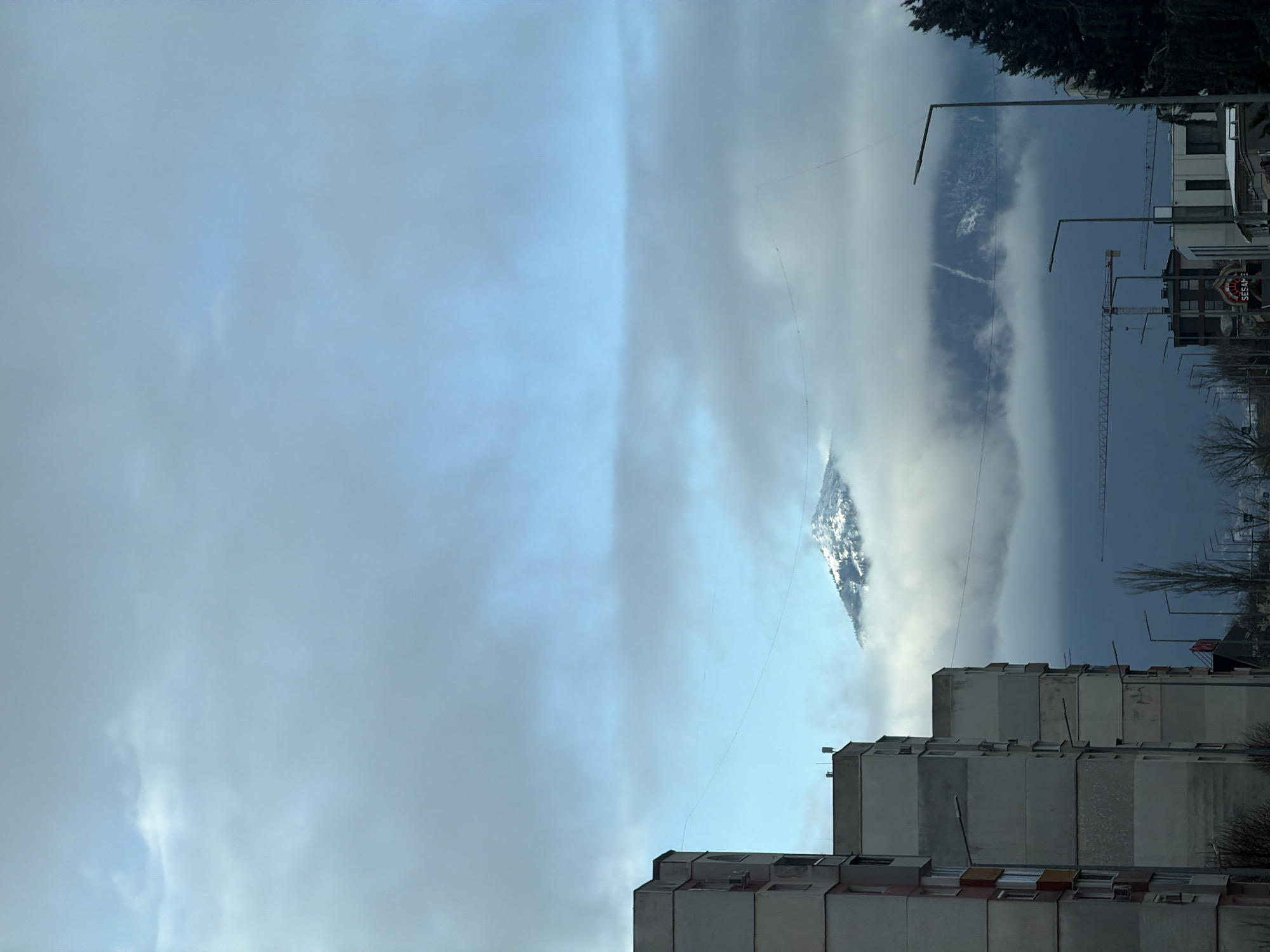 The image depicts an urban landscape, presumably in Sofia, Bulgaria, as indicated by the architecture and mountain. **Environment:** Overcast sky with heavy cloud cover. A mountain with snow-covered peaks is partially visible through a break in the clouds. **Objects:** Apartment buildings with visible wear and tear stand in the foreground. There is a street scene with utility poles, street lamps, and a crane construction in the midground. A building with a "SESAME" sign is also visible. **Subjects:** No people are visibly present in the image.