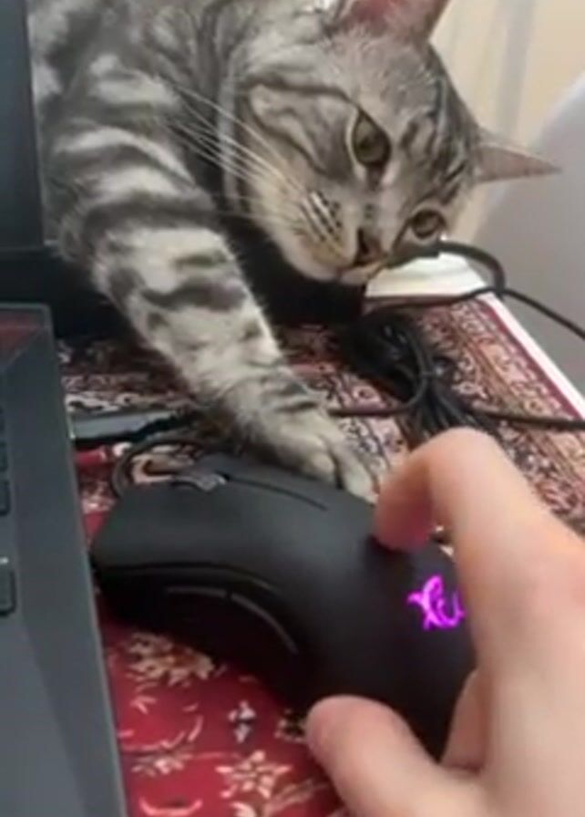 A silver tabby cat lies next to a laptop on a desk covered with a red patterned mat. The cat rests its left paw on a black gaming mouse, its attention fixed on the mouse. A person's hand is seen repeatedly pressing the button on the mouse, causing the logo on it to change colors from purple to green. The cat watches the changes in color without moving its paw.