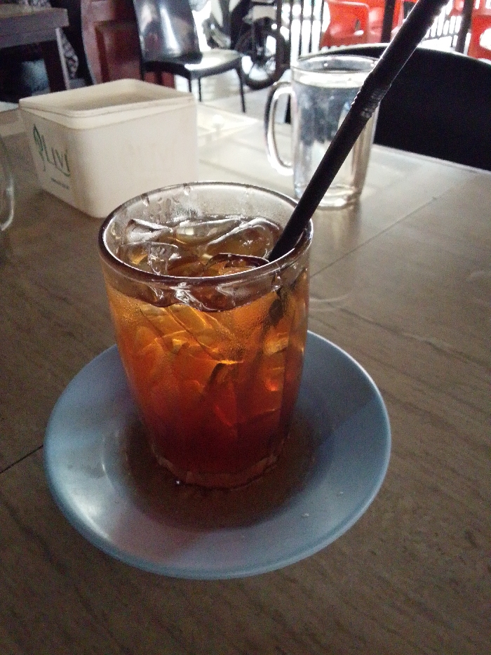 A close-up shows a glass of iced tea on a blue saucer