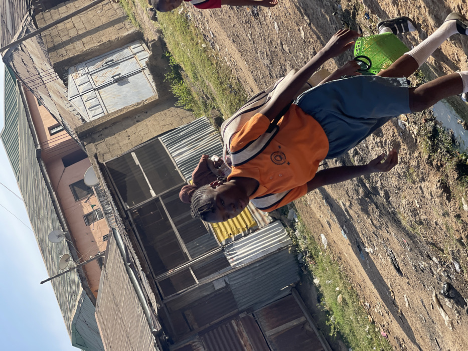 A young girl in an orange shirt, grey shorts, and white socks stands outside near buildings. She wears a backpack and is carrying a green basket. The buildings behind her are made of a variety of materials, including corrugated metal and concrete. There is some green vegetation in the background. The ground is dirt and has some trash scattered around. Another person is partially visible at the top of the image.