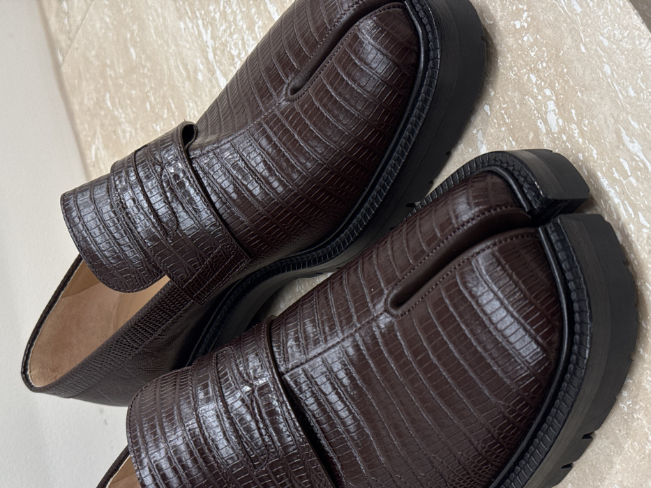 A pair of dark brown, split-toe (Tabi) loafers featuring a textured, scaled upper and thick, black lug soles is prominently displayed