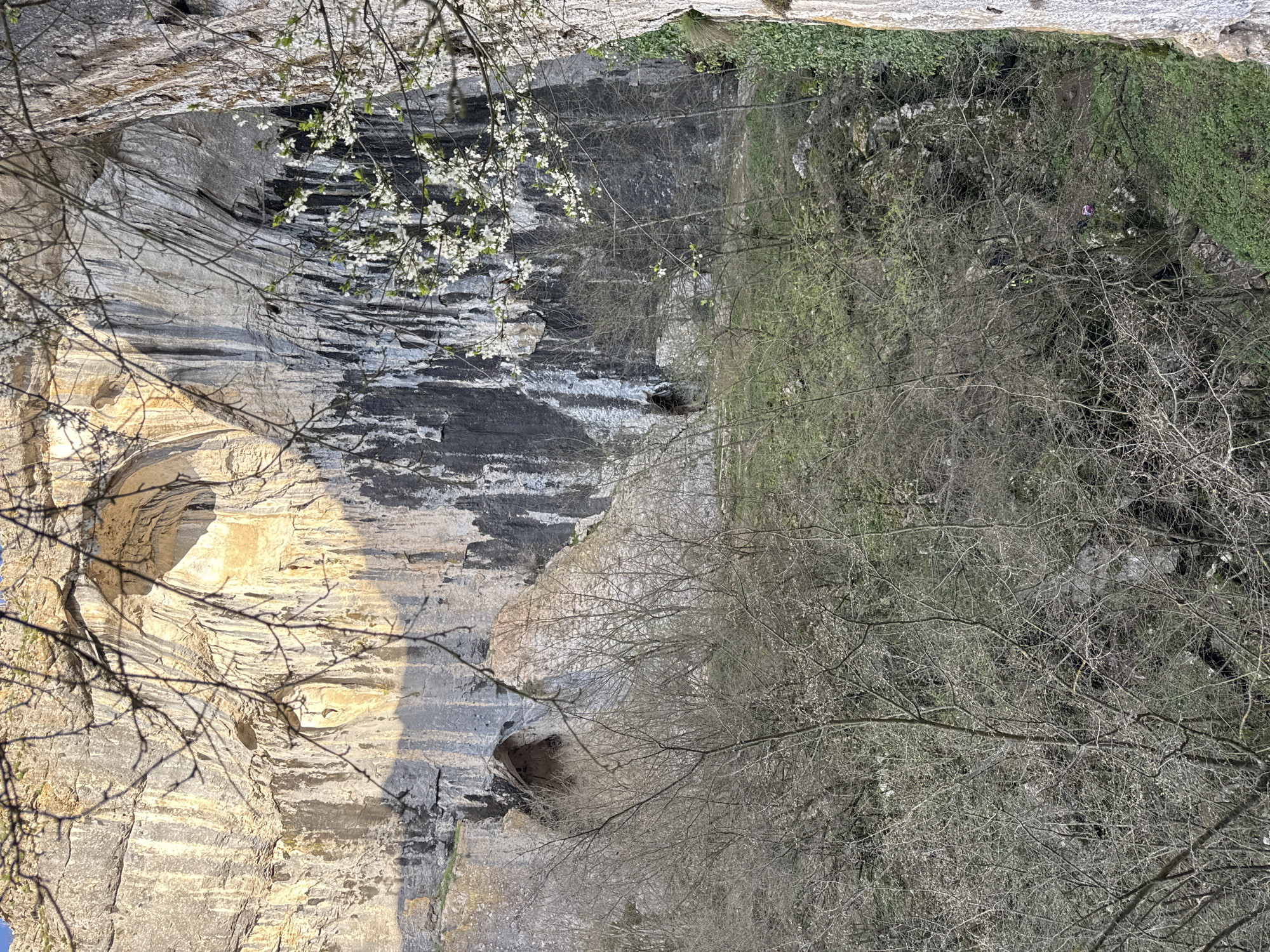 limestone cliff face with visible layering and erosion features, possibly located near Karlukovo, Bulgaria, based on the limestone formations typical of that region. The cliff has areas of both light-colored and darker, streaked rock. There are several small cave openings visible in the lower portion of the cliff. The left side of the image is dominated by the cliff face, while the right side shows a hillside covered with vegetation, including trees with bare branches, suggesting it may be early spring. A flowering tree branch with small white blossoms is visible against the cliff. The photograph is taken from an elevated perspective looking down towards the cliff and the hillside.