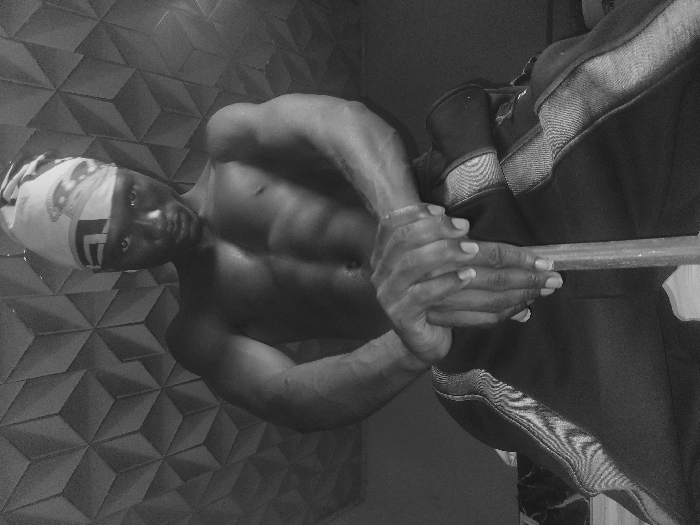 A Black man with a swimmer's cap is centered, showing his muscular torso. He is pulling himself up on a horizontal bar. He appears to be in an indoor setting, possibly a bathroom or workout area, with patterned walls. The image is in black and white and slightly rotated. The man is looking at the camera.