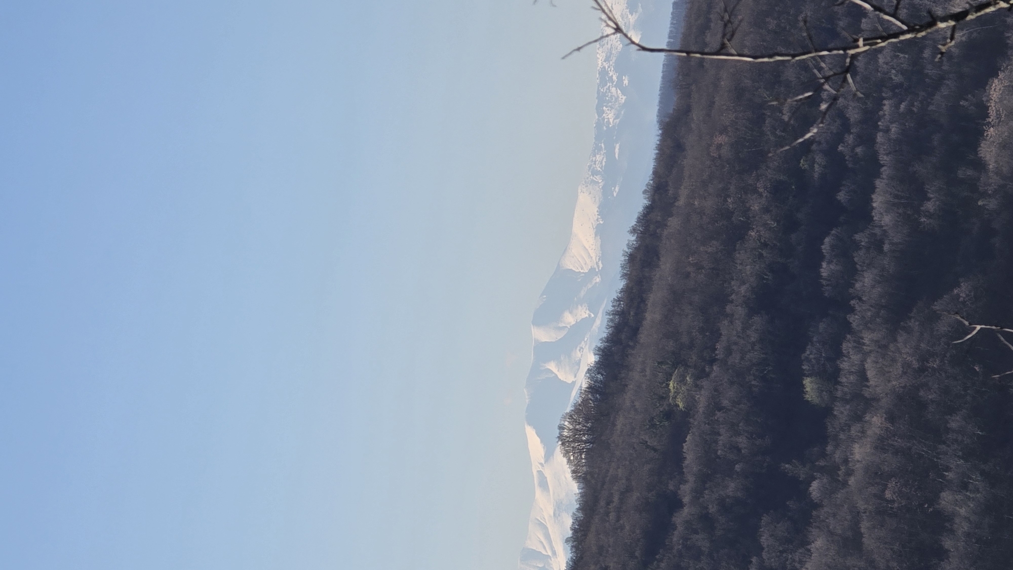 landscape scene, likely taken in Izvorche, Bulgaria. On the right, a dense, dark forest covers the terrain. Bare tree branches are visible in the foreground. To the left, there are snow-covered mountains under a clear, light blue sky. The image is taken with the camera oriented vertically.