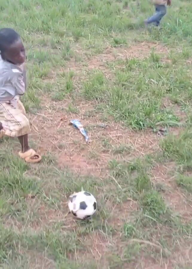 The video depicts a group of children playing soccer in a grassy field. They are wearing casual clothes and sandals. One child kicks the soccer ball with force, while others run to chase it. The environment includes green grass, some patches of dirt, and scattered debris. There are trees and bushes in the background. The children are focused on the game, moving dynamically across the field.
