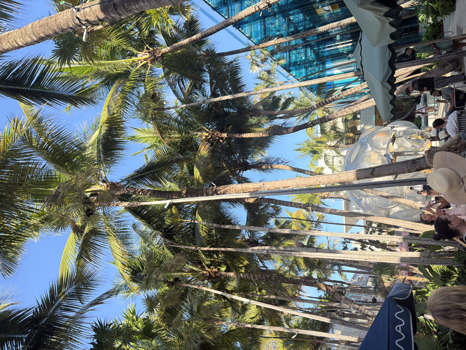 The image depicts an outdoor scene in the Miami Design District, Miami, Florida, United States, under a clear blue sky. Numerous tall palm trees with green fronds are prominently featured throughout the frame, their trunks varying in thickness and visible texture. In the central mid-ground, a large, white, spherical, multi-faceted sculptural structure, resembling a geodesic dome, stands amidst the trees. To the right of this sculpture, a modern building with a reflective blue glass facade is visible. In the foreground and mid-ground, an estimated fifteen to twenty individuals are present within what appears to be an outdoor dining or leisure area. Many are seated at tables shaded by two large patio umbrellas: one dark blue partially visible on the far left, and one light green/khaki on the right side. Individuals are dressed in casual attire. Specific subjects include a person with blonde hair in the lower left corner, partially obscured, and another person near the center holding a smartphone upright, seemingly capturing an image. An individual wearing a wide-brimmed straw hat is situated in the lower center of the frame. Other people are observed seated, standing, or engaged in conversation. Lush green foliage and tropical plants are visible at the ground level among the trees and structures.