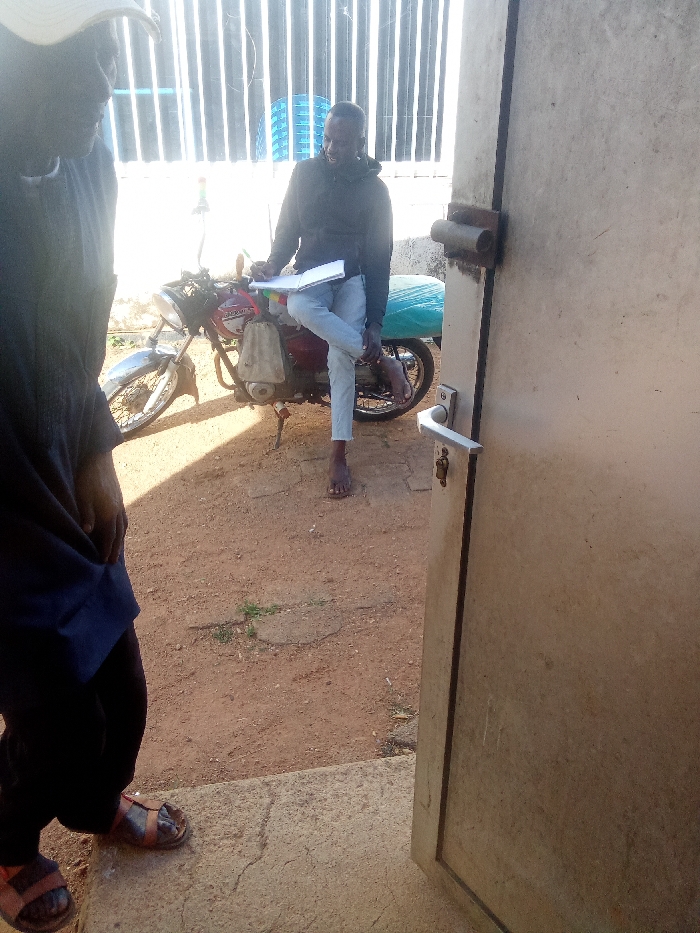 Two men stand in front of an open doorway. One man is closer to the door and faces away from the camera. The other man sits on a red and chrome motorcycle, which has a teal cloth draped over its back end. The man on the motorcycle wears a dark hooded sweatshirt and light blue pants, and he holds a notebook in his hands. The ground is covered with red dirt. A building with a corrugated metal roof is visible in the background.