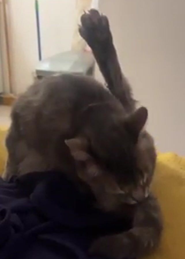 A grey cat is sitting on a bed, atop a blue piece of clothing or fabric. The bed has a yellow cover. The cat is grooming itself with its back leg raised high in the air, showing its paw. The paw is grey with pink pads and has sharp claws extended. A white wall with a blue handle or tool leaning against it is behind the cat. The camera zooms in on the cat's paw as it grooms itself. A blurry white plastic bag with pink writing on it is visible in the background, behind the paw.