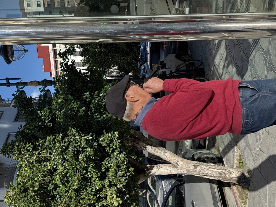 An elderly male subject is depicted in profile, standing on a paved sidewalk in an urban area of Tangier, Morocco, identified by a visible "A 10" designation on a car's license plate in the background. The man wears a black flat cap, clear-framed glasses, a blue collared shirt with a patterned scarf, a red long-sleeved sweater, and blue jeans. His right hand is raised to his mouth. To his left, a large tree with light, mottled bark and dense green foliage is planted in the sidewalk. In the background, multiple cars are parked along the street, including a light-colored vehicle with a partial Moroccan license plate "95501 | A | 10". A black bicycle is parked upright behind the man. Overhead, an ornate black street lamp is visible against a clear blue sky. Multi-story buildings, one with a red rooftop, form the distant background. A reflective vertical metal pillar, possibly part of a building facade, is prominent on the far right. The scene is brightly lit by natural sunlight, casting distinct shadows on the patterned grey sidewalk tiles.