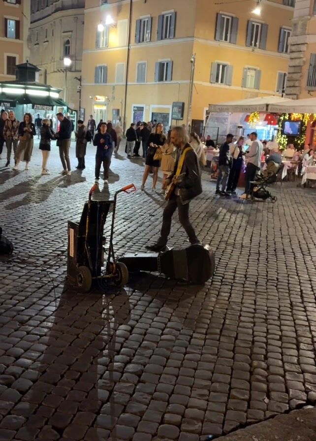 street musician playing guitar for a small crowd in a cobblestone square at dusk. The musician stands on a black platform attached to a small wheeled cart. He's wearing a dark jacket. A guitar case and a microphone stand are on the ground near him. Around him, people walk by, and some stop to listen. Behind them, there are multi-story buildings with lit windows, and some outdoor dining areas of restaurants with strung lights. The sky is a dark blue.