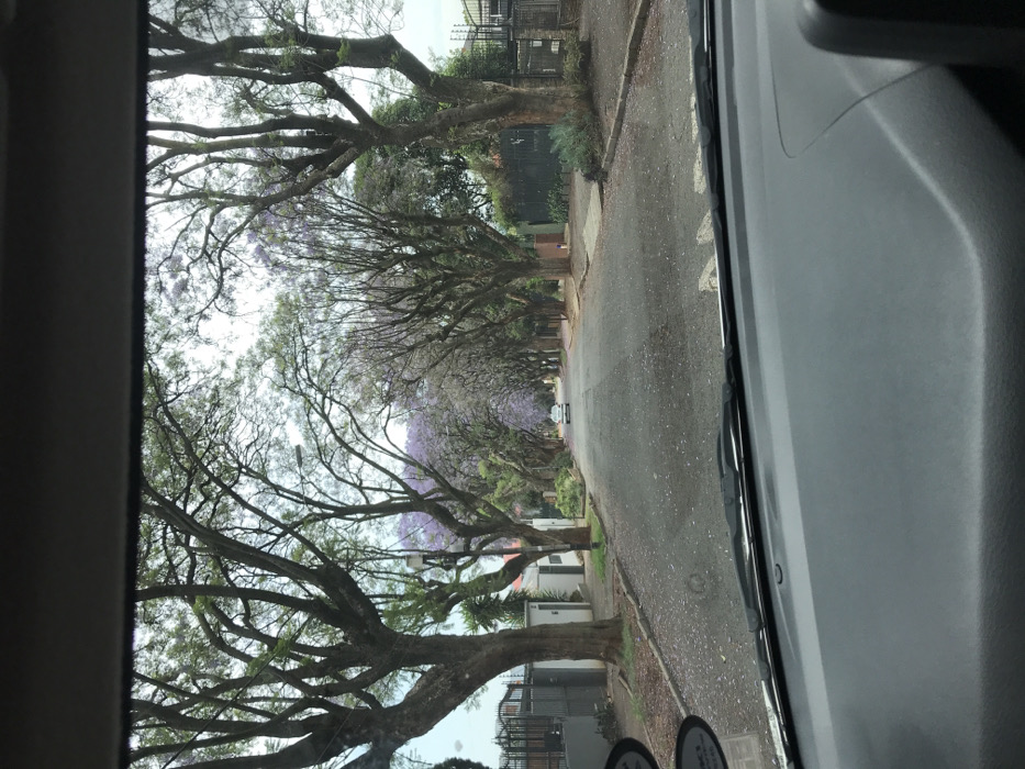 The image, captured from the interior of a vehicle, presents a longitudinal view down a tree-lined residential street in Johannesburg, South Africa
