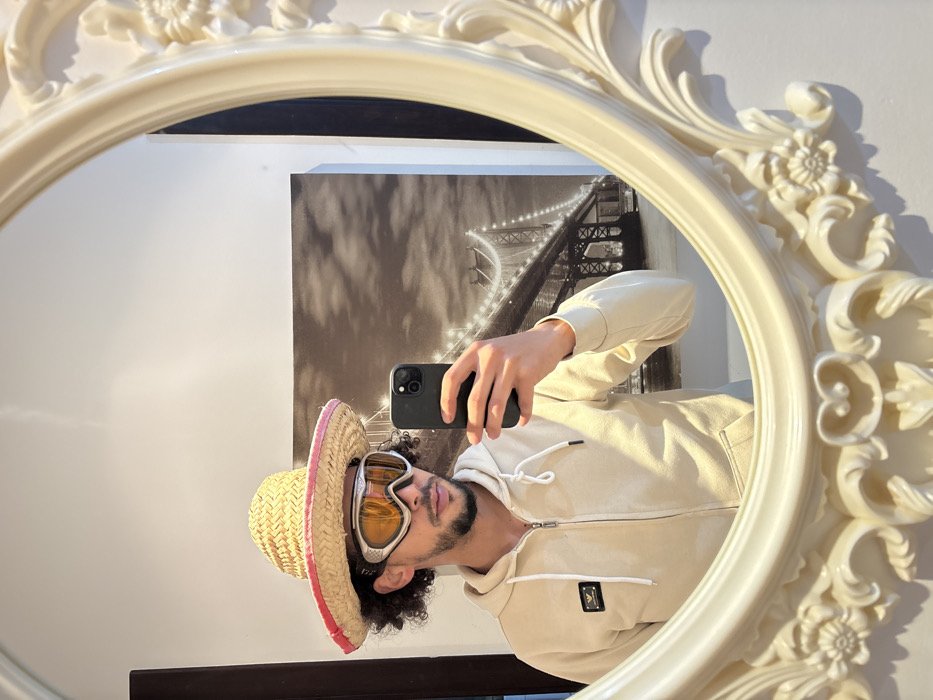 The image presents a mirror selfie taken indoors in M'Diq, Morocco. A male individual is reflected in an ornate, cream-colored oval mirror with a carved frame. He has dark, curly hair and a beard. He is wearing a woven straw hat with a pink-colored brim and silver-framed ski goggles with orange-tinted lenses over his eyes. He is dressed in a light beige zippered hoodie that features a dark, rectangular patch with a light emblem on the left chest area. His right hand holds a dark-colored smartphone, positioned to capture the reflection. The background visible in the mirror's reflection includes a plain white wall and a framed black and white photograph depicting an illuminated suspension bridge at night.