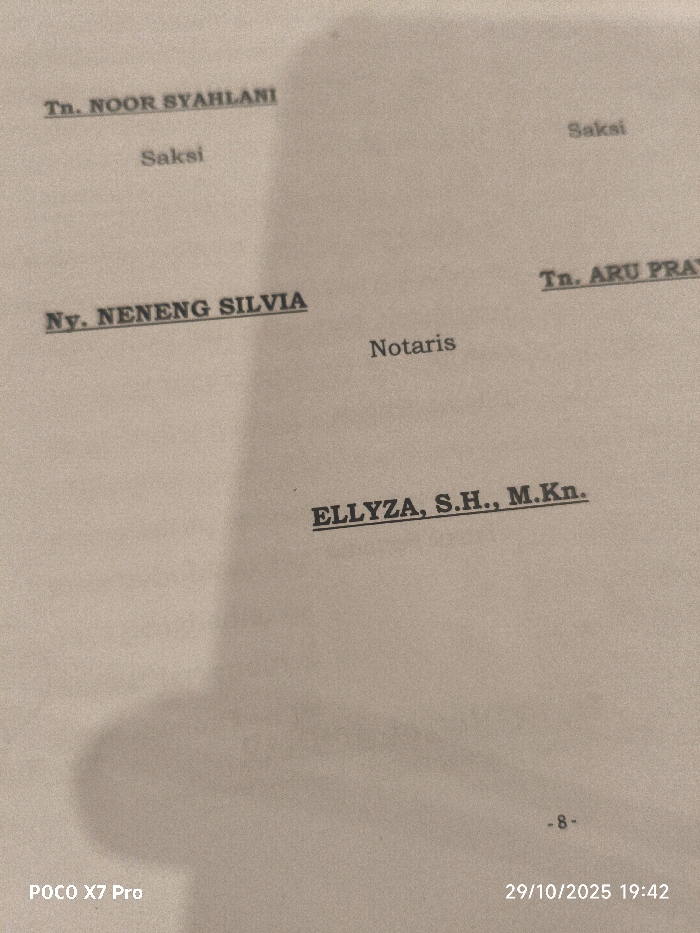The image displays a slightly angled photograph of a light-colored paper document, consistent with an official or legal record written in Indonesian. The document features printed text in a serif typeface. Key details include: "Tn. NOOR SYAHLANI" underlined, with "Saksi" (Witness) below it, in the upper-left. "Ny. NENENG SILVIA" is underlined on the mid-left. Centrally, "Notaris" is printed, with "ELLYZA, S.H., M.Kn." underlined directly below. On the upper-right, "Saksi" is visible, with a partially obscured name "Tn. ARU PRAT" below it. The page number "-8-" is located in the lower-right quadrant. A large, soft-edged shadow from an unseen object or hand covers the lower-left and central portions of the document. A "POCO X7 Pro" watermark is present at the bottom-left, and a timestamp "29/10/2025 19:42" is at the bottom-right. The image contains no visual or textual information to identify its location as the city of Pacet, Indonesia.