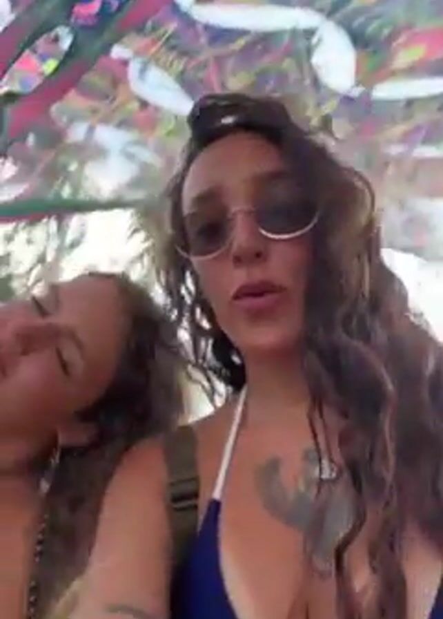 Two women are taking a selfie in front of a crowd of people at an outdoor event. The woman in the foreground wears sunglasses and a blue bikini top with a Phoenix tattoo on her chest. She has a green backpack strap across her shoulder. The woman next to her wears an orange top. A colorful geometric shade structure is overhead. They are both smiling and laughing, holding their hands up in the air. Palm trees are visible in the background.