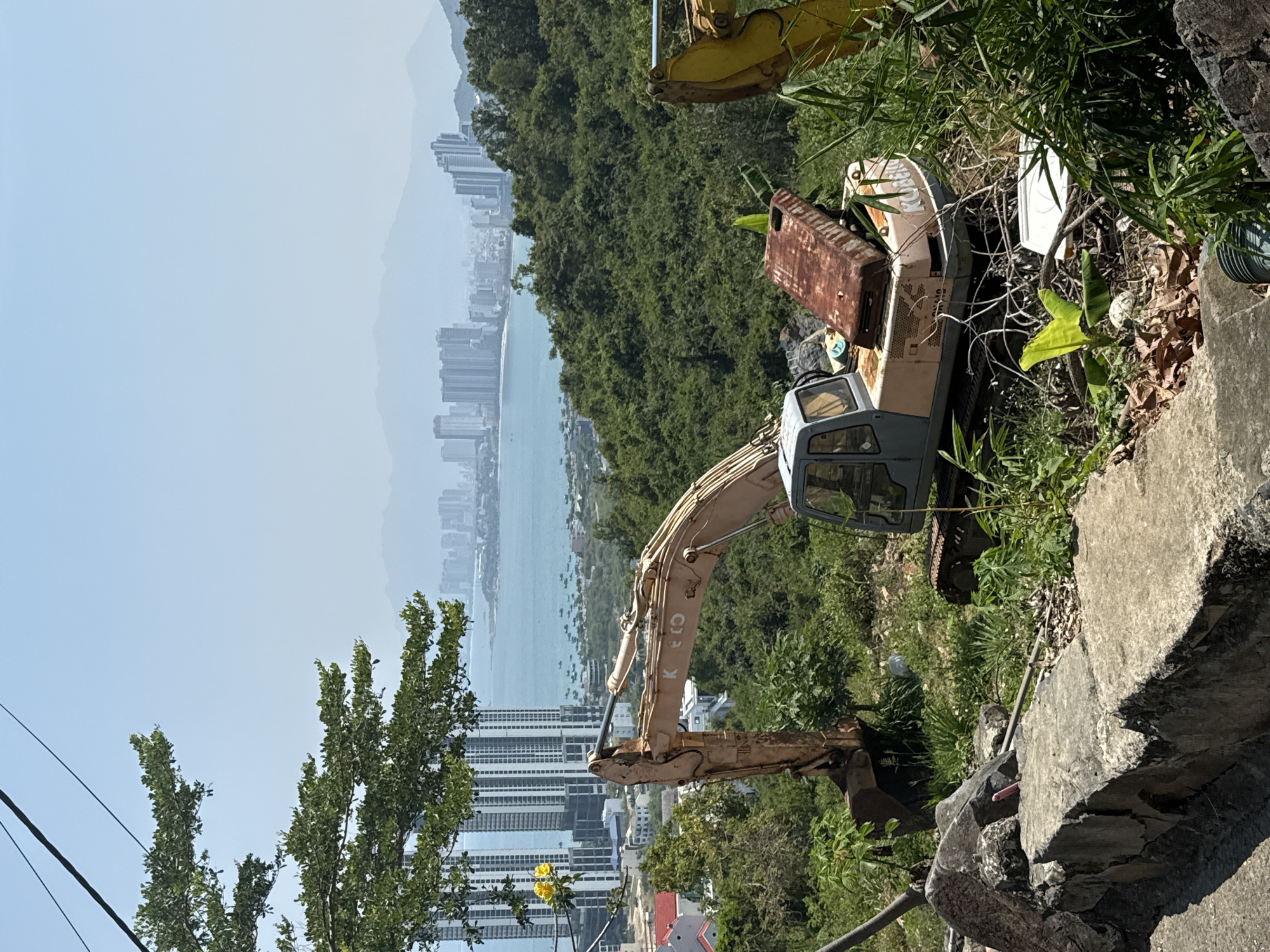 - "A partially obscured Komatsu excavator is positioned on a grassy slope with a cityscape in the background, which features several high-rise buildings" by FM-G4LVu2, licensed under CC BY 4.0
