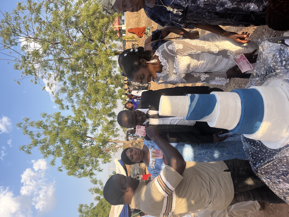The scene depicts an outdoor social gathering, likely a wedding celebration, under clear daylight conditions. In the immediate foreground, a five-tiered white cake with blue wave-like accents on the second and fourth tiers is positioned on a table. Surrounding the cake, a central group of five individuals is observed. A man on the left, wearing a light brown and white striped polo shirt and dark trousers, is extending his right arm towards a man in a black suit and white shirt, appearing to place Nigerian Naira banknotes into the suit jacket pocket of the man. The man in the suit looks downwards, with additional Naira notes tucked into his shirt. To the right of the man in the suit, a woman in a white long-sleeved lace wedding gown smiles, looking towards the man in the suit. She also has Naira notes visible near her left hand. Behind the man in the polo shirt stands a woman in a light blue patterned dress. On the far right, an older woman in a dark patterned garment is partially visible. The ground is dry and appears unpaved. In the midground, additional guests are present, some under a white tent structure with blue accents visible on the left. A light-colored vehicle is partially visible behind the tent. The background features numerous green-leafed trees under a bright blue sky with scattered white cumulus clouds. A building with a red roof is discernible in the far right background. Overhead power lines are visible in the upper right quadrant. The location is an outdoor venue in a semi-rural or developing urban area of Unknown, Nigeria.