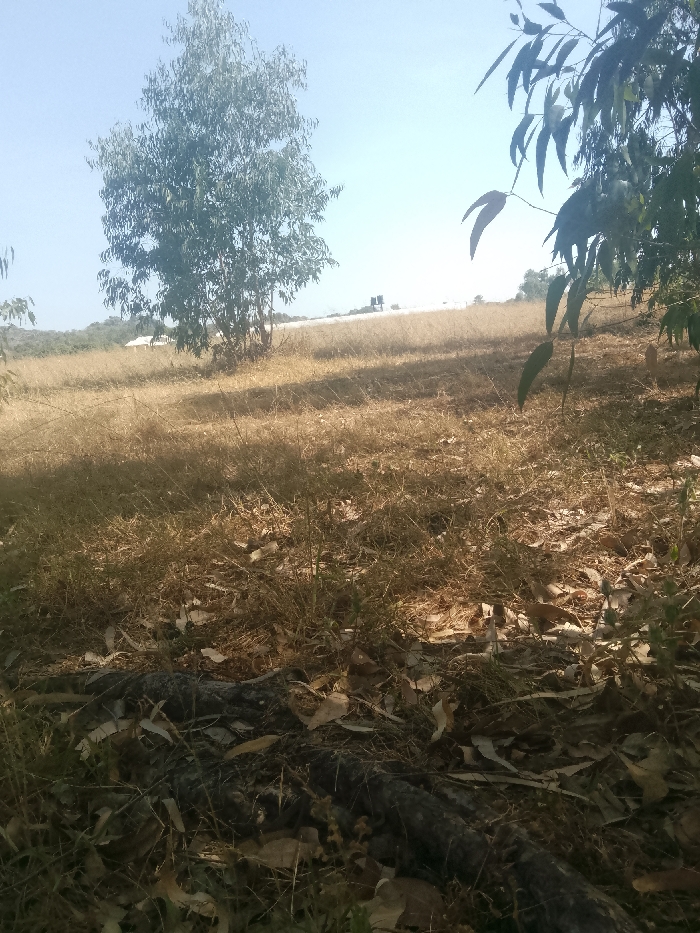 This image presents an outdoor, sunlit, semi-arid landscape in Jos, Nigeria. The immediate foreground displays exposed dark tree roots interwoven with dry, light-brown grass and scattered fallen leaves; sparse green sprouts are also visible. The midground is dominated by an expansive field of uniformly dry, golden-brown grass, marked by elongated shadows consistent with strong overhead illumination. In the background, a single, tall tree with dense green leaves stands centrally. Beyond this, a broad, light-colored surface, possibly a cleared ground area or paved expanse, extends horizontally under a pale blue, hazy sky. Against this distant light background, two dark, cylindrical structures, resembling water tanks, are faintly discernible. To the far left, distant green foliage and hills are visible. No human subjects or active events are present within the frame.