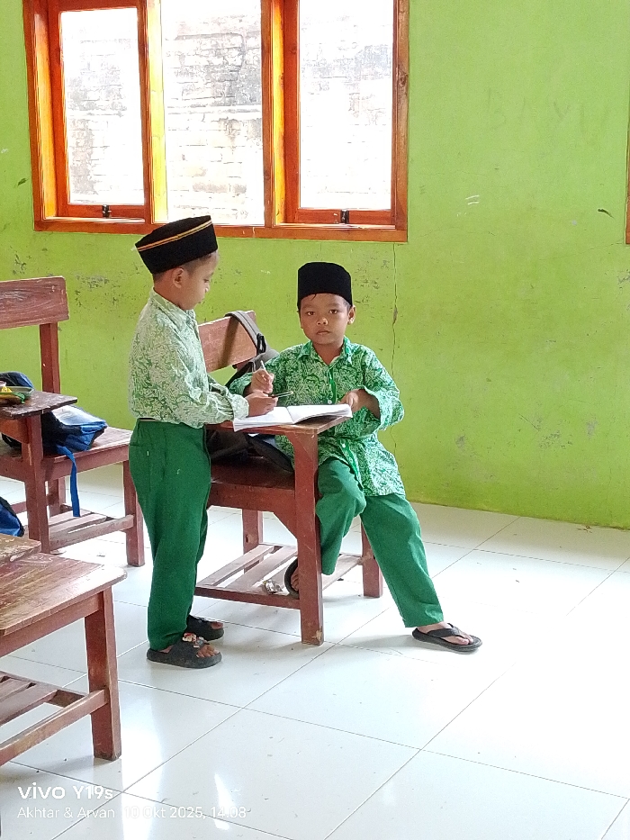 An interior shot depicts two young males in what appears to be a classroom or study environment in Jagapura Kidul, Indonesia. The room features light green walls, a white tiled floor, and three rectangular windows with brown wooden frames in the background, allowing natural light. Wooden desks and chairs are present. One boy, positioned on the left and standing, wears a black peci cap, a green and white patterned long-sleeved shirt, and green trousers, paired with dark sandals. He is leaning slightly over a wooden desk, holding a writing implement in his right hand and resting his left hand on an open notebook or book situated on the desk. His gaze is directed downwards at the book. The second boy, seated at the wooden desk to the right, also wears a black peci cap, a matching green and white patterned long-sleeved shirt, and green trousers, with dark flip-flops. He holds a writing implement in his right hand over the open book/notebook and rests his left hand on it. He looks directly forward towards the viewer with a neutral expression. A blue backpack is visible on the floor to the left of the standing boy. The interaction suggests collaborative learning or instruction, with the standing boy appearing to assist or observe the seated boy's work.