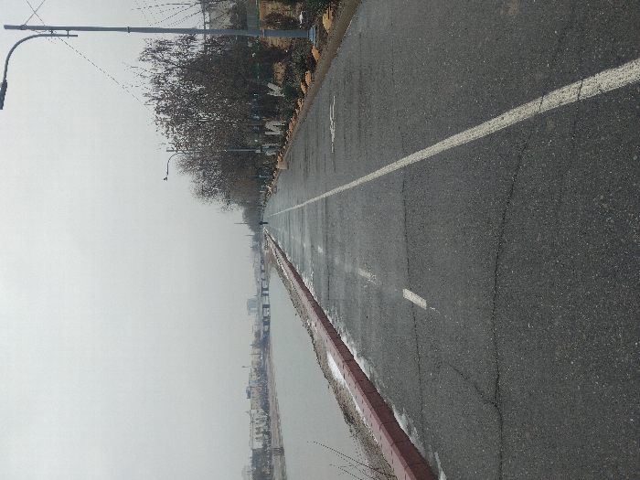 A paved road stretches into the distance under a cloudy sky. A solid white line divides the road, which is bordered by a red and grey curb on one side and trees and foliage on the other. The water is to the left of the road, with buildings visible in the distance. Streetlights line the road, adding to the urban landscape on an overcast day.