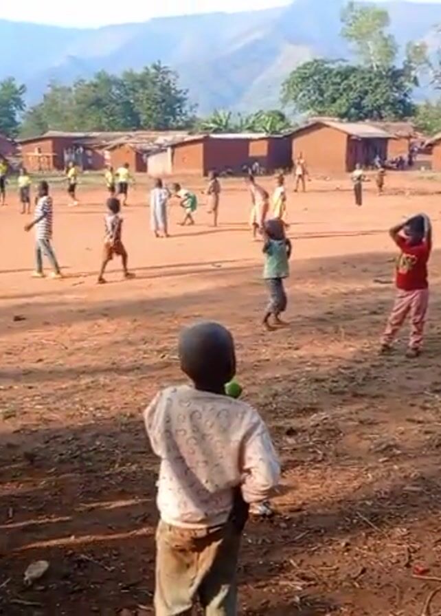 A group of approximately 30 children are spread across a dirt field, with a few buildings and trees in the background