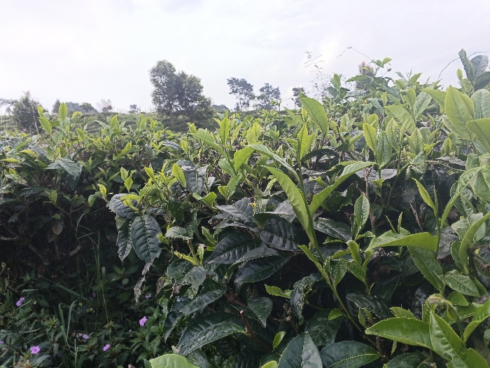 The image depicts a verdant, cultivated field of plants resembling tea bushes, situated in Siem Reap, Cambodia. The foreground is filled with dense foliage, primarily showing dark green, mature leaves interspersed with numerous lighter, bright green new shoots and buds. Small, purple-pink flowers are visible among the undergrowth in the lower-left section. The field extends into the midground, maintaining a uniform appearance of rows of low-lying plants. The background features a hazy, light grey sky dominating the upper portion of the frame, with indistinct darker trees visible along the distant horizon line. No individuals, man-made structures, or specific actions are discernible within the frame.