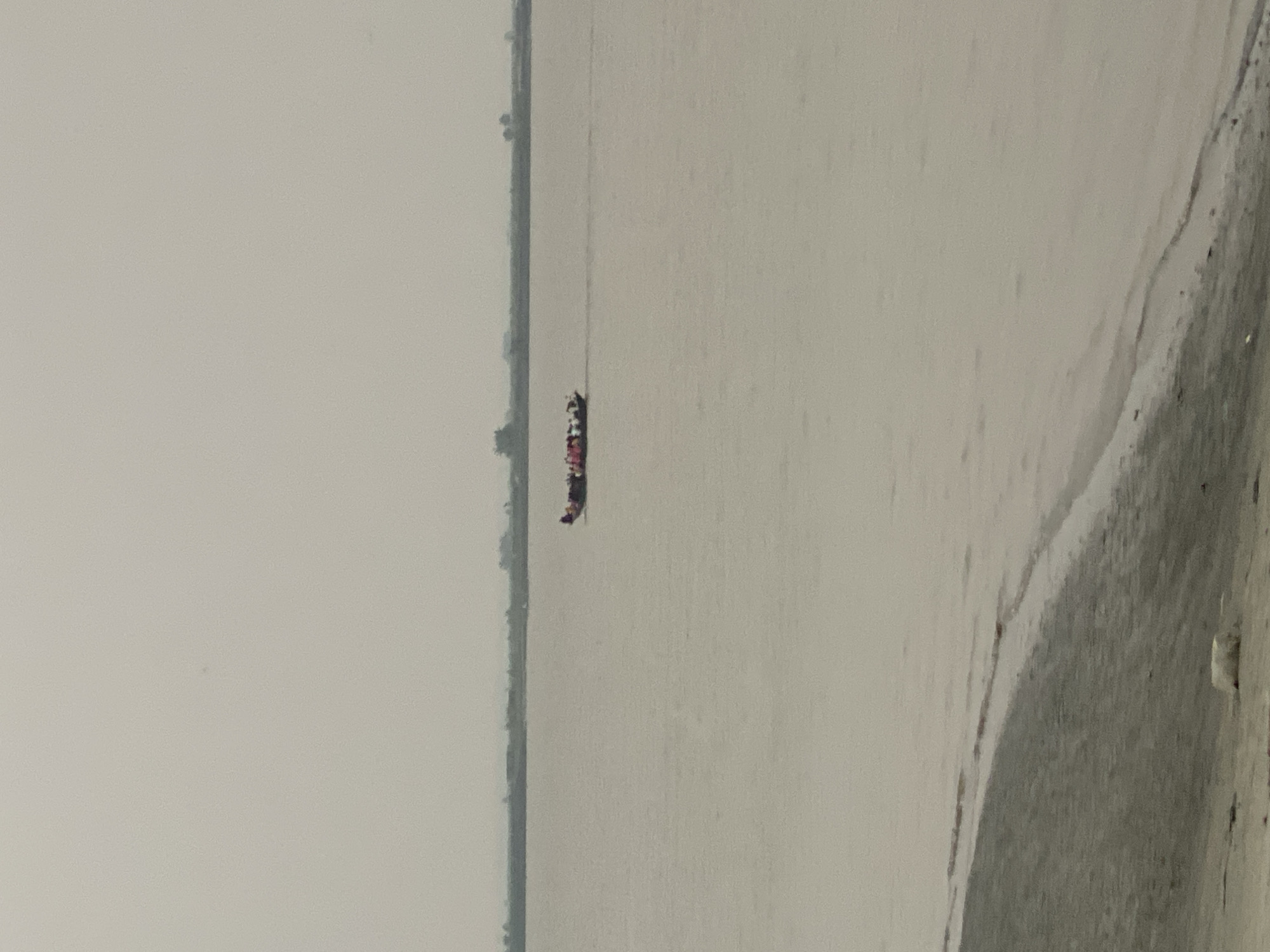 The image displays a wide, placid river scene under a uniformly light grey, overcast sky, located in the city of Unknown, Bangladesh. In the mid-distance, an elongated, dark-hulled boat is traversing horizontally from right to left across the frame. The boat carries an estimated 10 to 15 individuals, who appear seated and are indistinct, though some clothing exhibits brighter colors. A subtle wake trails the moving boat. The river water is a consistent light brown-grey. In the lower left quadrant, a gently sloping shoreline of dark grey sand or mud meets the water, showing minimal wave activity. A faint, dark horizontal line on the distant horizon suggests a landmass.