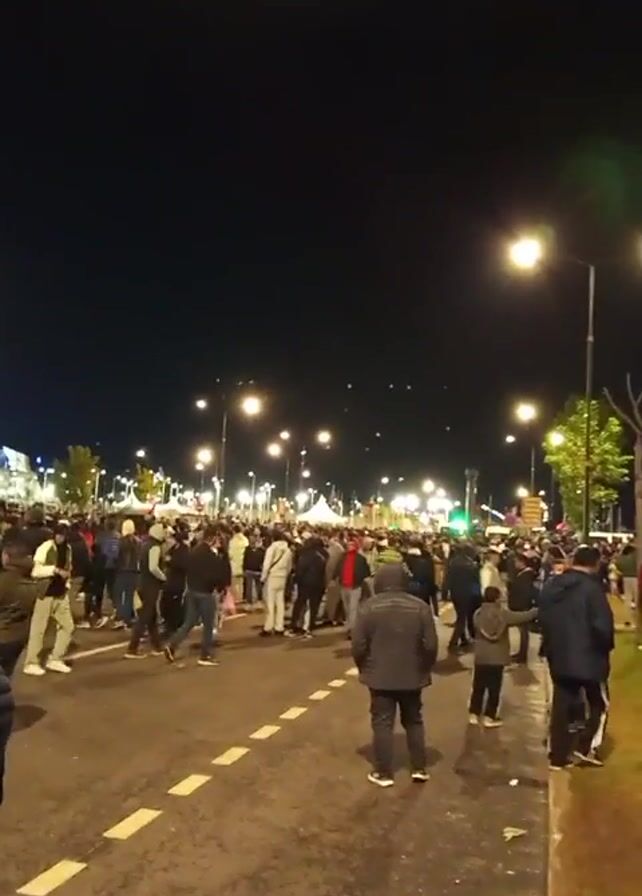 At night, a crowd of people is gathered in a public space. The crowd is dense, with people of various ages and clothing styles. They are standing and walking in the same direction. Streetlights illuminate the scene, and there are several tall buildings visible in the distance. Emergency vehicles are stationed in the crowd. The sky is dark.