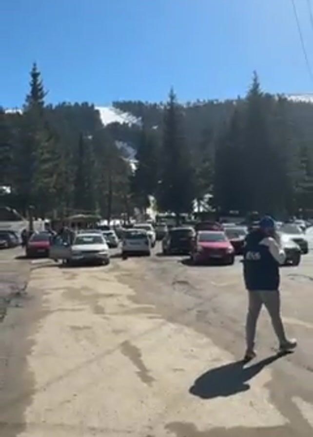 parking lot filled with cars on a sunny day. A forest is visible in the background, and a ski slope can be seen on a mountain in the distance. People are standing around some of the cars, with a man in a blue jacket walking in the foreground. The ground is dirt and appears somewhat muddy.